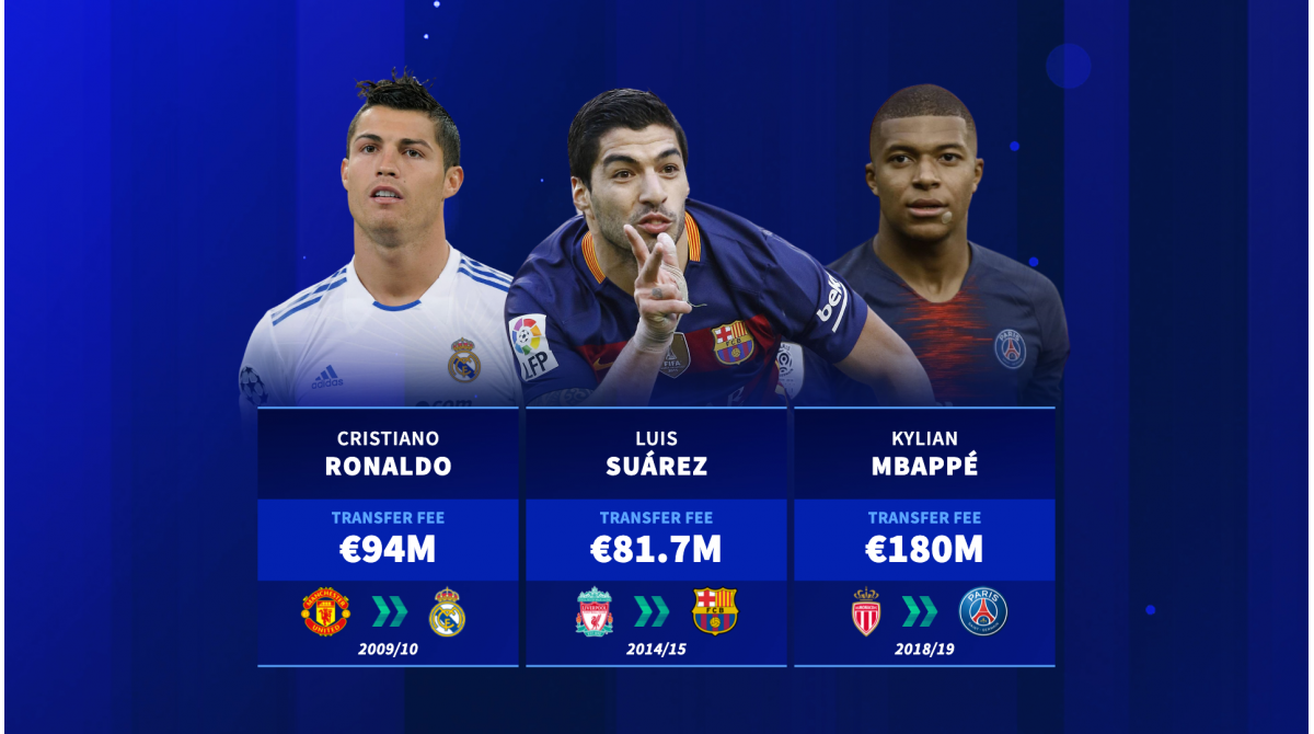 In the summer of the 2015/16 season, it was Man City bringing Kevin De Bruyne back to the Premier League from Wolfsburg for €76m. The following summer at the commencing of the 2016/17 season the record deal was Paul Pogba’s €105m move from Juventus to Man United. IN the 2017/18 summer the most expensive deal remains the world record fee to this day in Neymar’s €222m move from Barcelona to PSG. in 2018/19 PSG were at it holding the record for Kylian Mbappé’s €180m permanent transfer from Monaco. In the summer of the 2019/20 season, João Felix’s €127.2m move from Benfica to Atlético held the record.