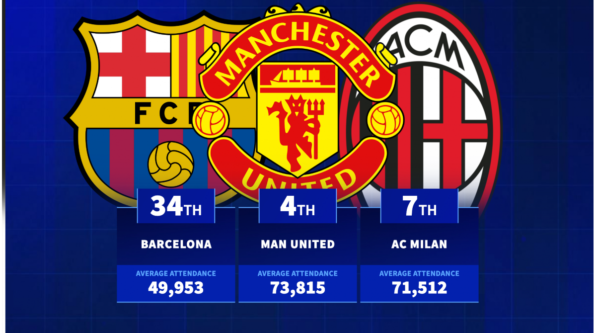 As the graphic above illustrates, Manchester United (73,815) are the top English club with Real Madrid (72,692) possessing the biggest average attendance in Spain. Three Italian clubs feature in the top ten – AC Milan, Inter Milan and Roma – with Marseille the only representative from France. Interestingly, Celtic feature in 16th with Flamengo the only other non-European club in the top twenty, outside of River Plate. Barcelona only sit in 34th place due to playing at the Olympic Stadium as the Nou Camp undergoes redevelopment but the Catalan giants will likely take top spot when the near 100,000 stadium is completed.
