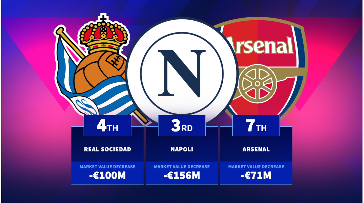 In third come Serie A champions Napoli. Despite their on-field success, their ageing squad meant their market value decreased by -€156m since September. LaLiga outfit Real Sociedad are fourth with a -€100m decrease, whilst Premier League side West Ham take fifth with a -€82m downgrade. Bundesliga’s RB Leipzig are sixth, having dropped by -€77m in squad value, with the Premier League’s second-placed side Arsenal seventh with a -€71m drop. Ligue 1 club Lyon take eighth, having dropped by -€61m, and they are joined by Saudi Pro League side Al-Hilal and LaLiga’s Girona in ninth and tenth – both also with a -€61m downgrade.